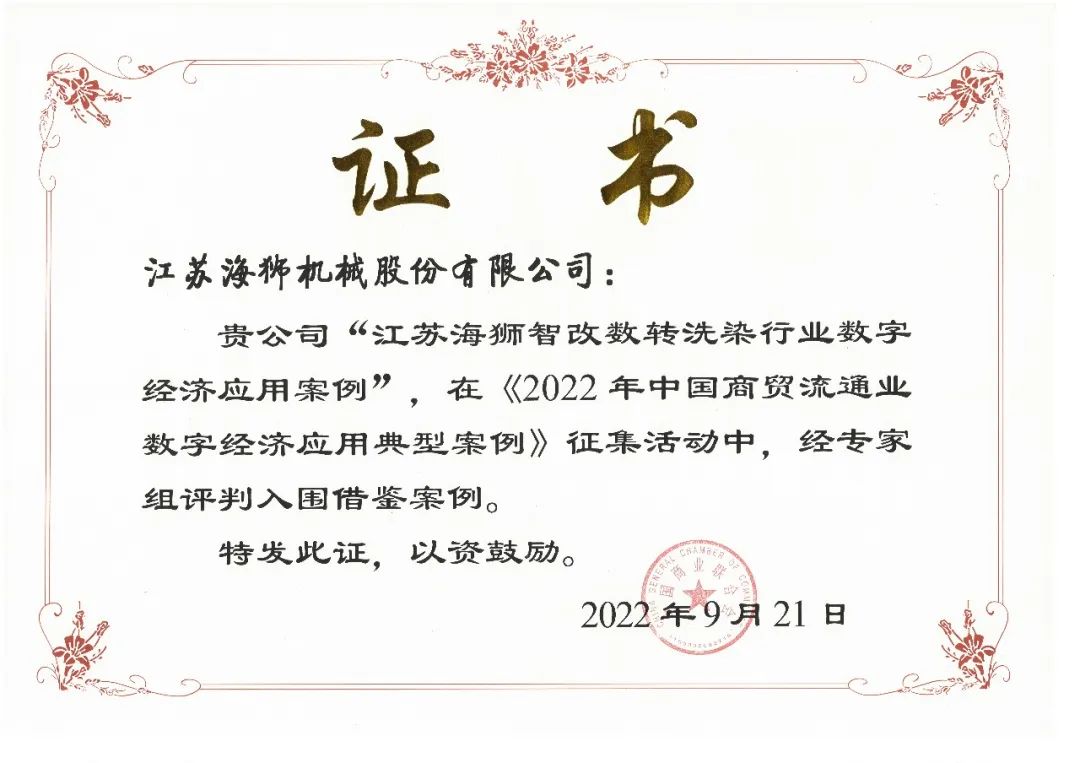 海獅機(jī)械智改數(shù)轉(zhuǎn)洗染行業(yè)數(shù)字經(jīng)濟(jì)應(yīng)用案例入圍中國商業(yè)聯(lián)合會《2022 年中國商貿(mào)流通業(yè)數(shù)字經(jīng)濟(jì)應(yīng)用典型案例》
