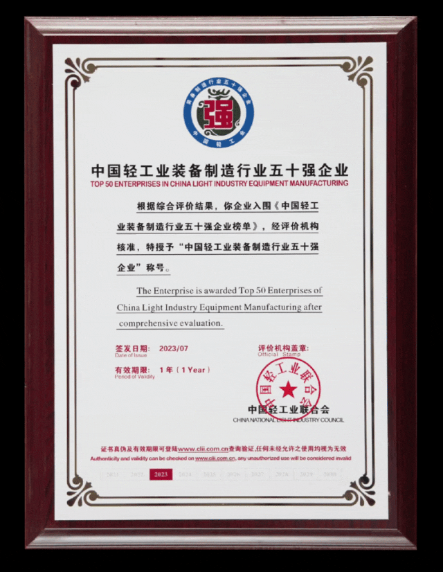 會上,中國輕工業(yè)聯(lián)合會發(fā)布了2022年度輕工裝備五十強(qiáng)企業(yè)評選結(jié)果,江蘇海獅機(jī)械名列第15位。